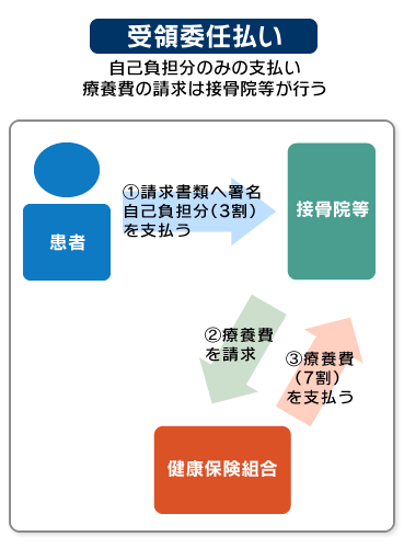 接骨院等での施術費用は、原則としていったん患者が全額を負担し、事後に健保組合に申請して7割分の還付を受ける「療養費」の取り扱いとなります。しかし、利便性が考慮された結果、都道府県との協定を結んでいる接骨院等では、療養費の支給申請を柔道整復師に委任することができるようになり、保険医療機関と同様、原則3割の自己負担のみで施術を受けられるしくみになっています。(受領委任)