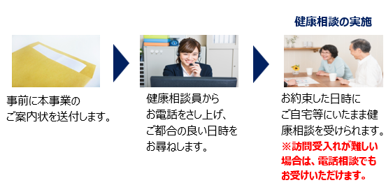 このキャンペーンは対象者の健康上の不安などを解消し、将来の健康寿命を延ばしていただきたく、健保組合より事業の委託をしましたSOMPOヘルスサポート(株)の専門相談員(保健師・看護師等の有資格者)がご自宅にお電話またはお伺いをして、健康に関するご相談に応じた具体的なアドバイスを無料でさせていただくものです。